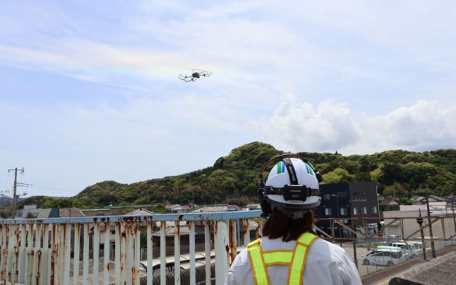 DXやAI、IoTなどの先端技術を積極的に取り入れ、スマートメンテナンスの推進に力を入れている当社。その中でもドローン事業は、当社にとってまさにイノベーションをもたらした存在とも言える。人の立ち入りが困難であった場所での点検を実現し、従来の常識を覆した。建物の異常や劣化を、より安全かつ効率的に確認するという新たな可能性を切り拓き、昨今の受注件数は右肩上がり。イベントの参加や他社との競技大会への出場など、勢いは止まらない。