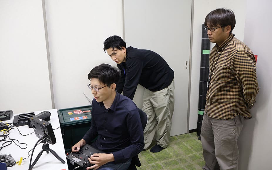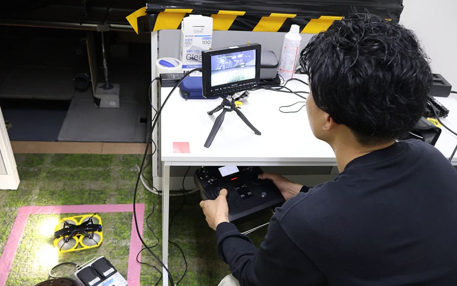 「フライトするにあたり、マイルールのようなものがあります。例えばプロポ(操縦機)は毎回同じ位置、椅子の腰掛具合、始める前のルーティーン(携帯しているものを全てテーブルの上に出す、時計を外すなど)を大切にしています。自分が操縦している機体のカメラを通して手元のモニターを見ているのですが、モニターとの距離が変わってしまうと、操作が変わってしまうんです。」と今年入社し、当グループの仲間となった森田主事は話す。