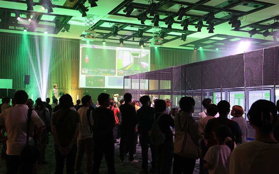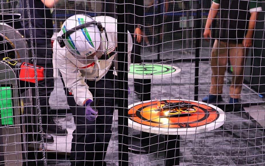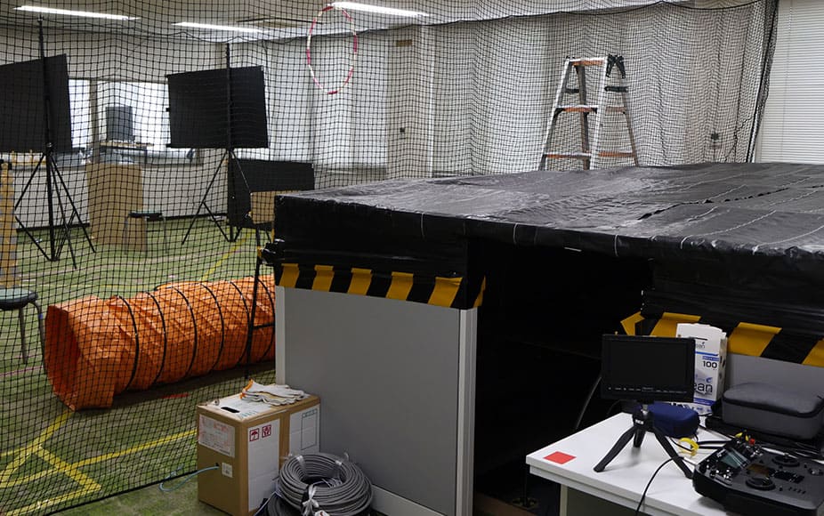6/8(日)大会当日、早朝からリハーサルが始まった。初めて見る会場や空間に当社パイロットを含め、多くの関係者が緊張と期待でいっぱいだった。当社はトップバッターということもあり、リハーサルも1番手。ヒート順(操縦順)にフライトを開始した。本大会は3人1組のチーム戦。1試合あたり3回のフライトで、各回異なるメンバーが1人ずつ順番にフライトする。1人の制限時間は5分、3回の合計飛行時間が短いチームの勝利(ただしミッション成功により飛行時間が減算されるタイムボーナス有)となる。