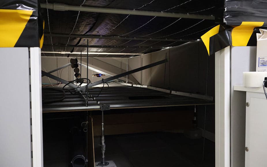 そもそも狭所でのドローン飛行は、GPSが届かないため機体の安定性が低く、操縦が非常に難しい。安定した飛行を実現するには操縦技術だけでなく、事前準備と現場での対応力が欠かせない。現場では事故なく飛行するために、事前の計画と下見が重要となる。飛行範囲を絞り、ロケハンでは脚立に登って目視で点検場所を確認し、全箇所は見ることができなくても飛行ルートの「当たり」をつけて対応している。