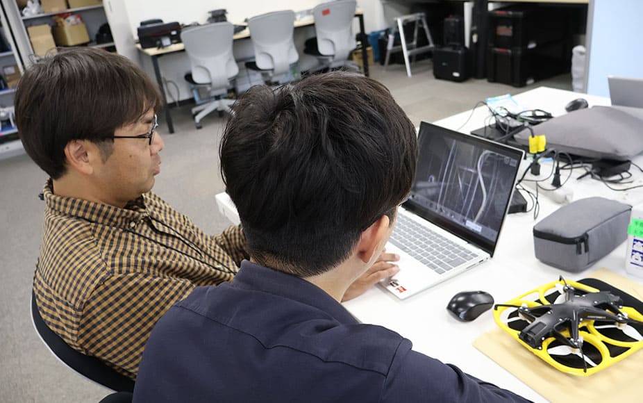 多くの現場をこなし、経験も豊富な石井副課長は「フライトしていると方向感覚がわからなくなってしまって。そこでサブパイロットの指示がすごく重要で、思ったより機体が壁に寄っていたり、自分では気づけないようなところをサブパイロットが教えてくれます。建築の知識とマッチングしているんですよね、図面を見ながら空間を把握していくところが。内部の構造が把握しきれないため、外側の建築設備を手がかりに飛行ルートを探るしかない。まずは目安をつけながらマッピングを行い、いきなり点検に入るのではなく、現場を散策するような感覚で「今日の現場」を知っていくようにしています。」とサブパイロットの重要性やこれまで培ってきた建築の知識が活きている様子を強く語った。