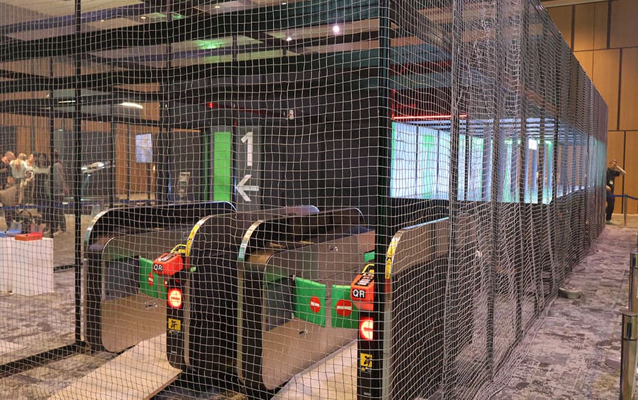 当社のヒート順は松本課長→森田主事→石井副課長。A社との初戦、両社緊張が走る中レーススタート。フライトするコースはIBIS2の使用を想定した、実務環境に近いコースが再現された。そのため左右上下スラローム(上下移動を交えた飛行)や土管飛行(パイプ管のすり抜け)、暗所空間でのフライトを経て改札機へ向かい、Suicaを装着し改札機にタッチをして通過する、というものであった。Suicaの操作と空間認識を含む複合的な操縦を遠隔で行うことは容易ではない。各チームともゴール前ではミスが起こり、Suicaを落としてしまう場面も…。安定飛行と正確な空間把握が求められた。