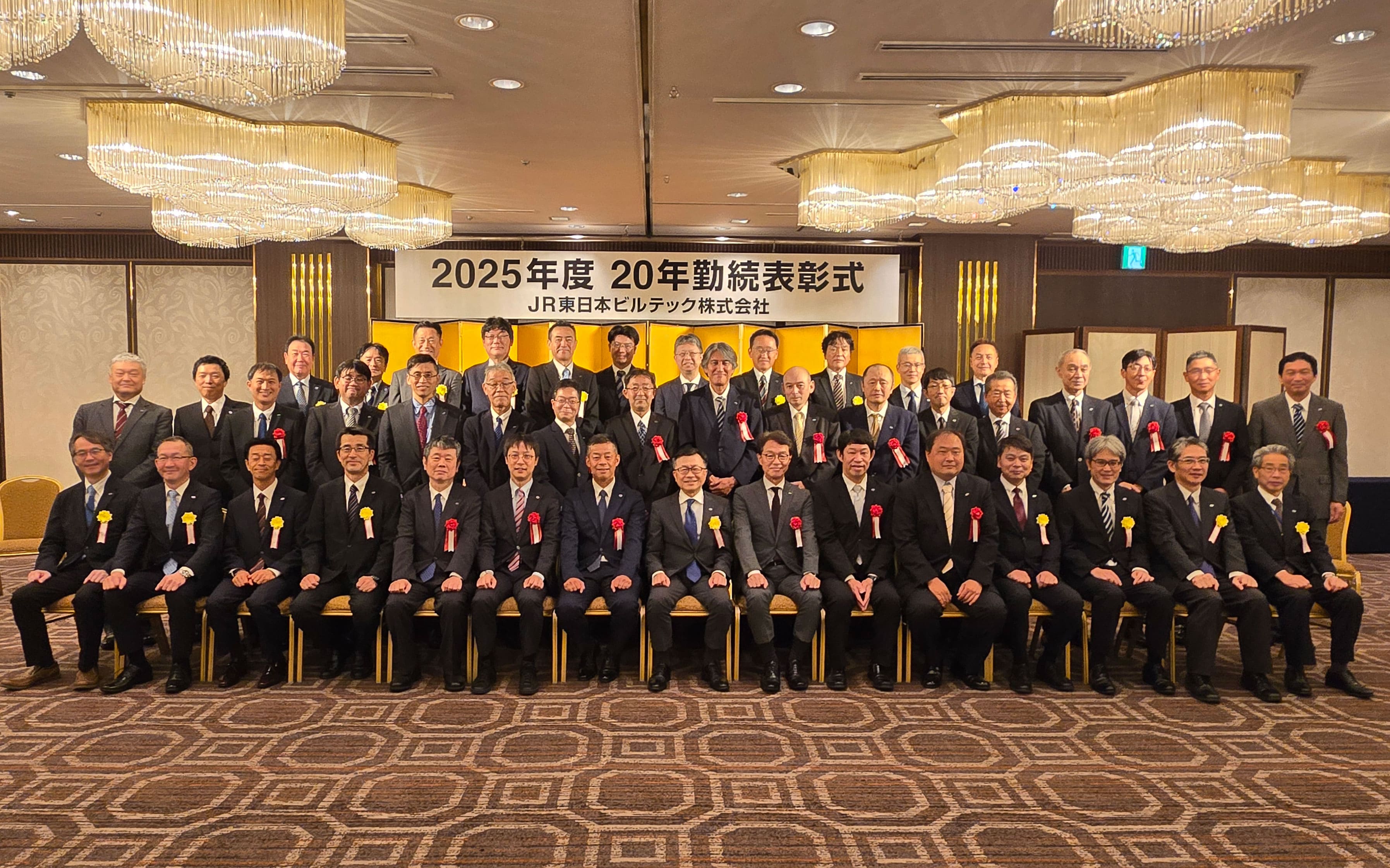 10月17日(金)、ホテルメトロポリタン池袋にて表彰を受けた勤続20年の社員の中には、入社まもなく新潟県中越地震(2004年10月23日発生)の復旧対応を行った方々もおり、度重なる自然災害対応など、数々の困難を共に乗り越えながら、この間の会社の成長・発展を支えていただきました。