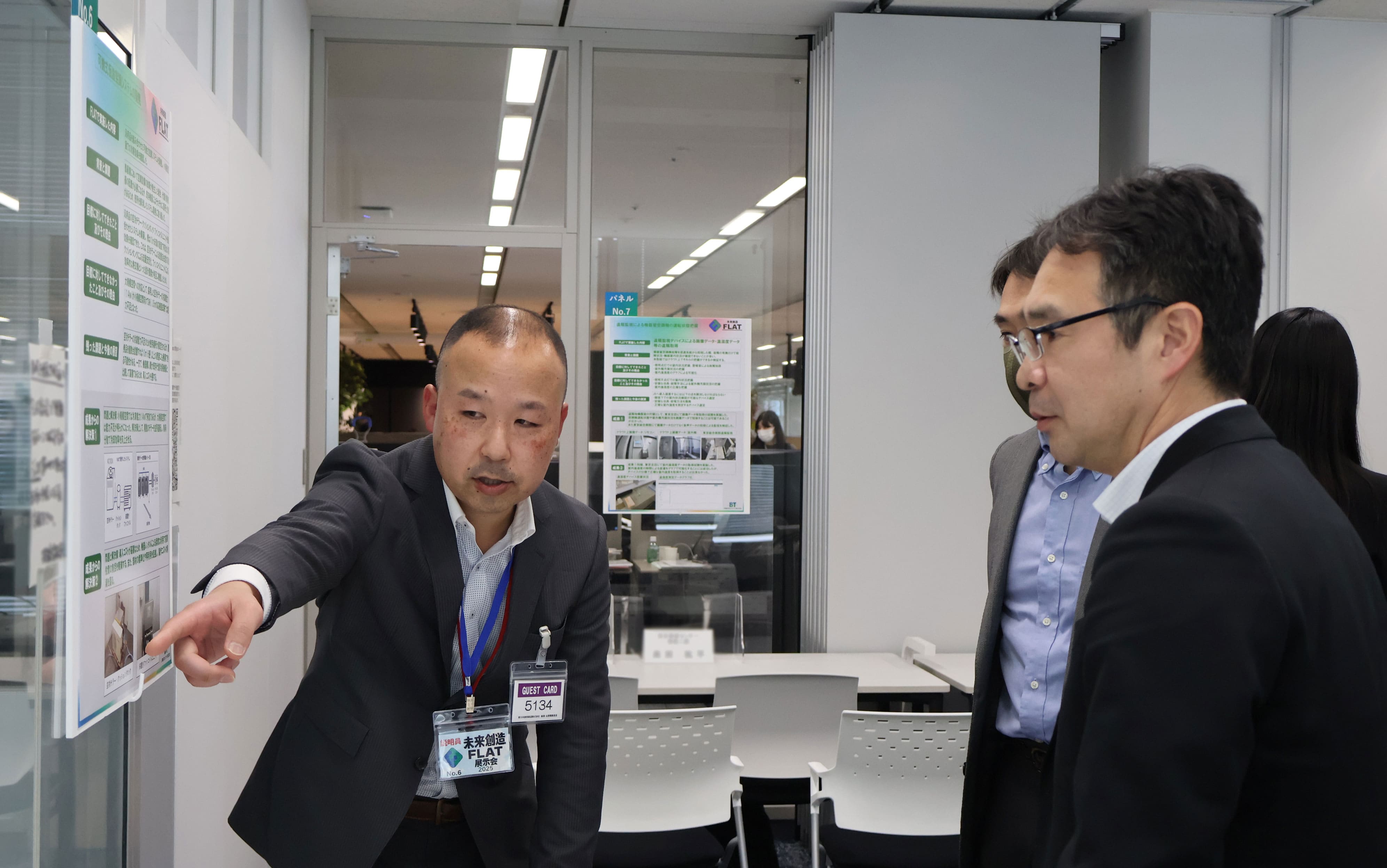 今回で2回目となる本展示会では、昨年度比1.5倍となる23点を出展。説明展示・パネル展示・実物展示の3ブースに分けて開催し、件名担当者が取組内容や検証結果等を詳しく説明しました。参加者からの質問にも丁寧に回答し、理解を深める機会となりました。実機に触れられる展示も多く、さまざまなテーマが集まったことで、会場では出展者と参加者の活発なコミュニケーションが生まれました。